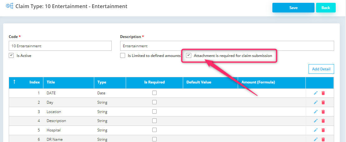 Go to Claim Type > Tick Attachment is required for claim submission.