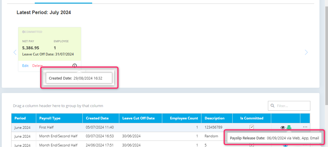 7. Enhanced the process payroll screen to include created date and payslip release date.