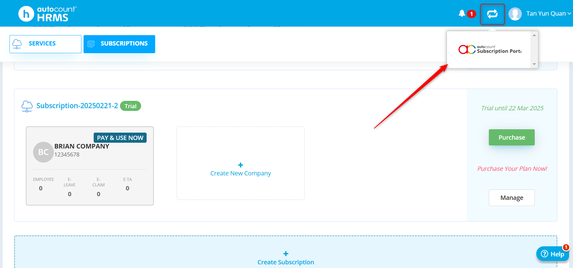 To add a new billing party via the subscription portal, you must first go to the subscription portal by clicking onto the icon next to the notification bell at the top right corner to access into the Subscription Portal.