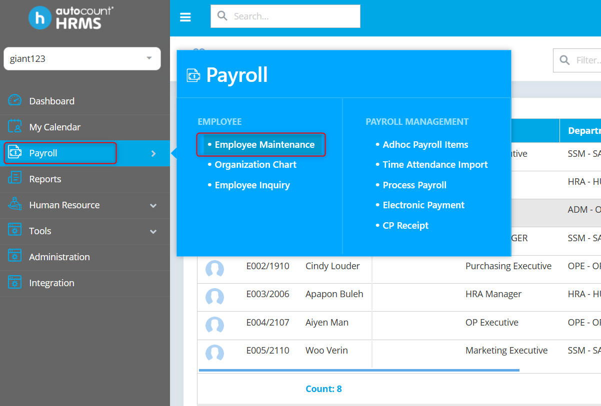To check on an employee's tax status, click on Payroll > Employee Maintenance under Employee.