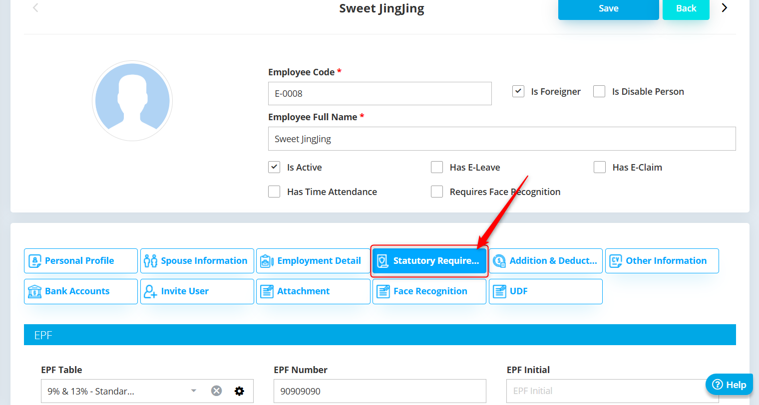 Once in the employee’s profile, go to the Statutory Requirement tab and scroll down until you see Tax Status. Make sure that the tax status shows Resident and that the Tax Borne by Employer is not ticked.