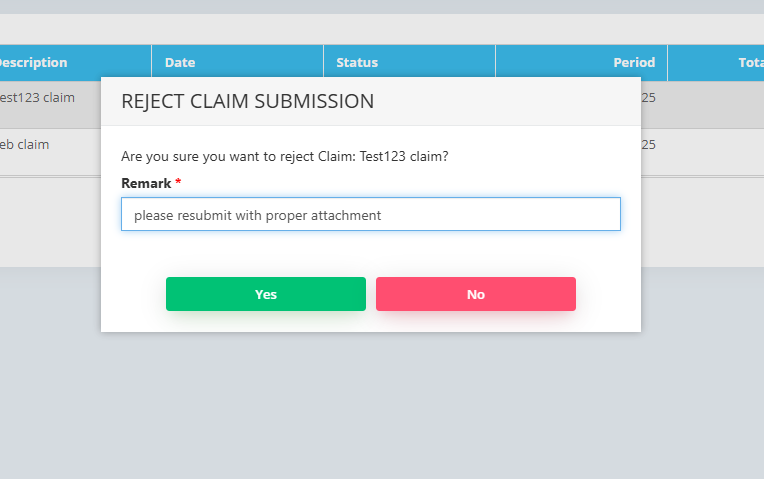 The user would then be required to key in the reason for the cancellation of the approved claim. Once done, click on Yes to cancel the approved claim.