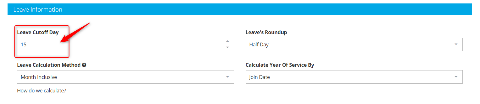 Leave Cutoff Day in the company profile setting is not related to Leave Cut Off Date field when processing new payroll. Instead, it is used to determine the leave cutoff day to calculate leave entitlement. This setting will affect leave entitlement calculation.