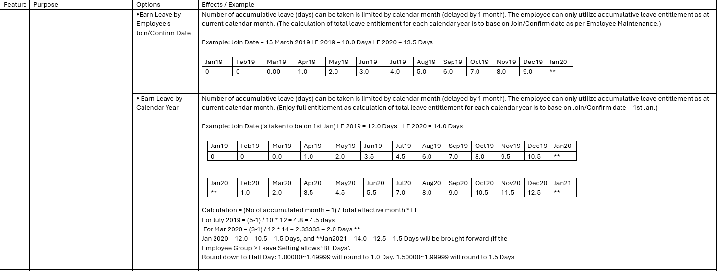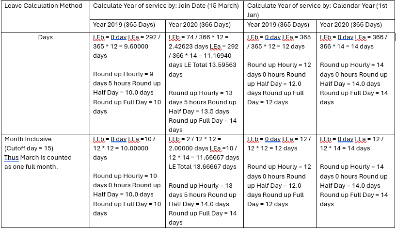 | Leave Calculation Method | To calculate total leave entitlement in each calendar year | • Days • Month Inclusive • Month Proportion | General Formula: is tied to length of service. So usually leave entitlement in each calendar year is the total of 2 parts. Part 1 is leave entitlement before join date (LEb) and part 2 is leave entitlement after join date (LEa). For example: Peter join on 1 Apr 2019, his first year of service will be crossing 2019 and 2020 (1/4/2019 ~ 31/3/2020) For 2020: LEb = 2nd part of his 1st year entitlement LEa = 1st part of his 2nd year entitlement So, formula for leave entitlement of a calendar year (LE): LE = LEb + LEa Days: To calculate LEb and LEa based on number of days respectively. Example: Join date is 1/4/2019 For 2019: LEb = 0 LEa = 275/365 x 1st year entitlement. For 2020: LEb = 91/366 x 1st year entitlement. LEa = 275/366 x 2nd year entitlement Month Inclusive: To calculate LEb and LEa based on number of months (full month, no decimal point) respectively. Example: Join date is 10/4/2019 For 2019: LEb = 0 LEa = 9/12 x 1st year entitlement. For 2020: LEb = 3/12 x 1st year entitlement. LEa = 9/12 x 2nd year entitlement Month Proportion: To calculate LEb and LEa based on number of months (with 2 decimal points) respectively. Example: Join date is 10/4/2019 1~9 Apr = 9 days = 9/30 = 0.3 month 10~30 Apr = 21 days = 21/30 = 0.7 month For 2019: LEb = 0 LEa = 9.70/12 x 1st year entitlement. For 2020: LEb = 3.30/12 x 1st year entitlement. LEa = 9.70/12 x 2nd year entitlement |
