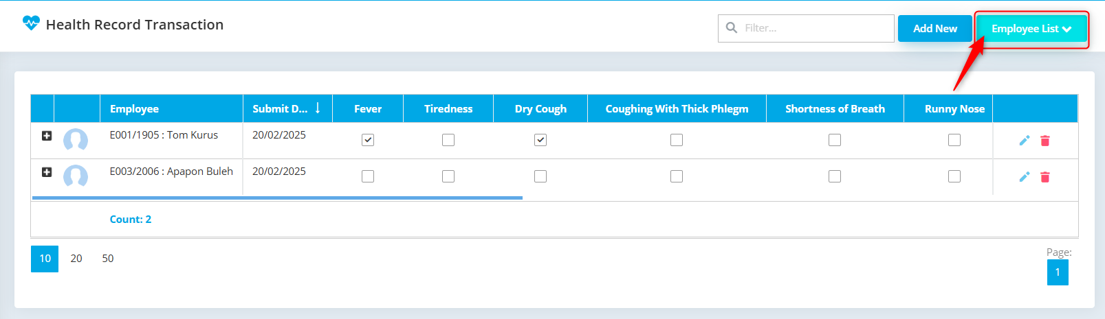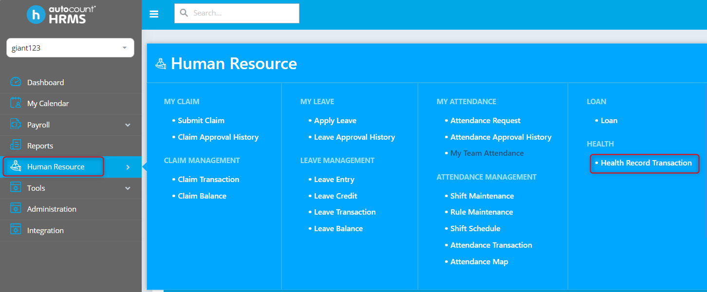 To export a list of employees on the health records, click on Human Resource > Health Record Transaction.