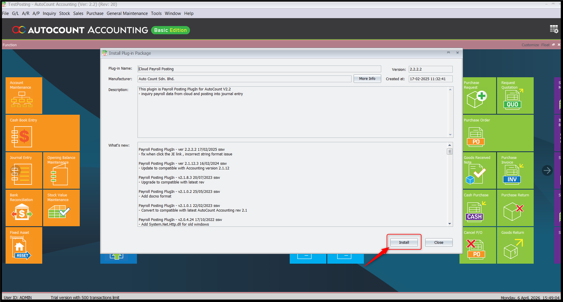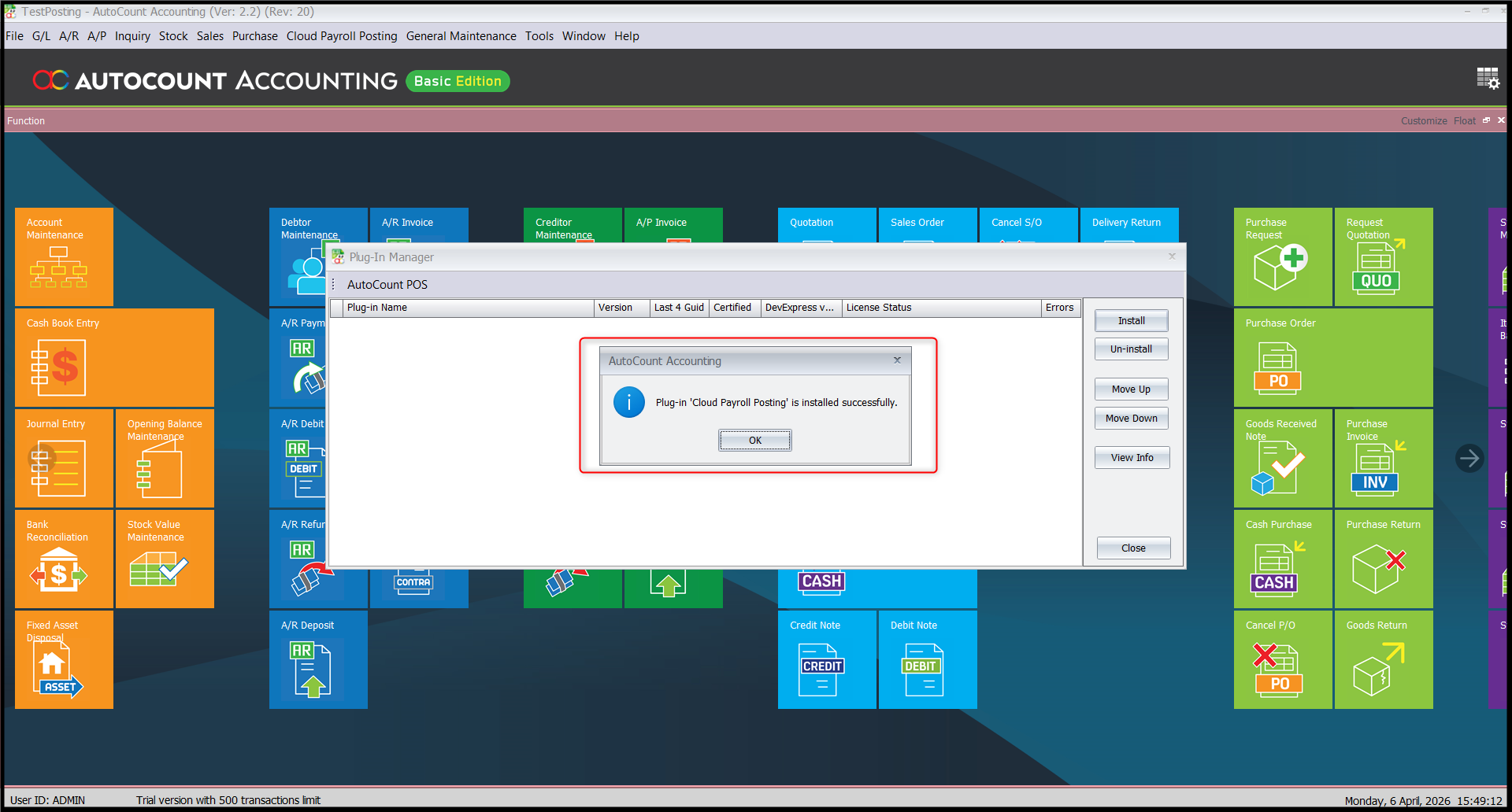 - A confirmation message will appear: "Plugin "Cloud Payroll Posting" is installed successfully."