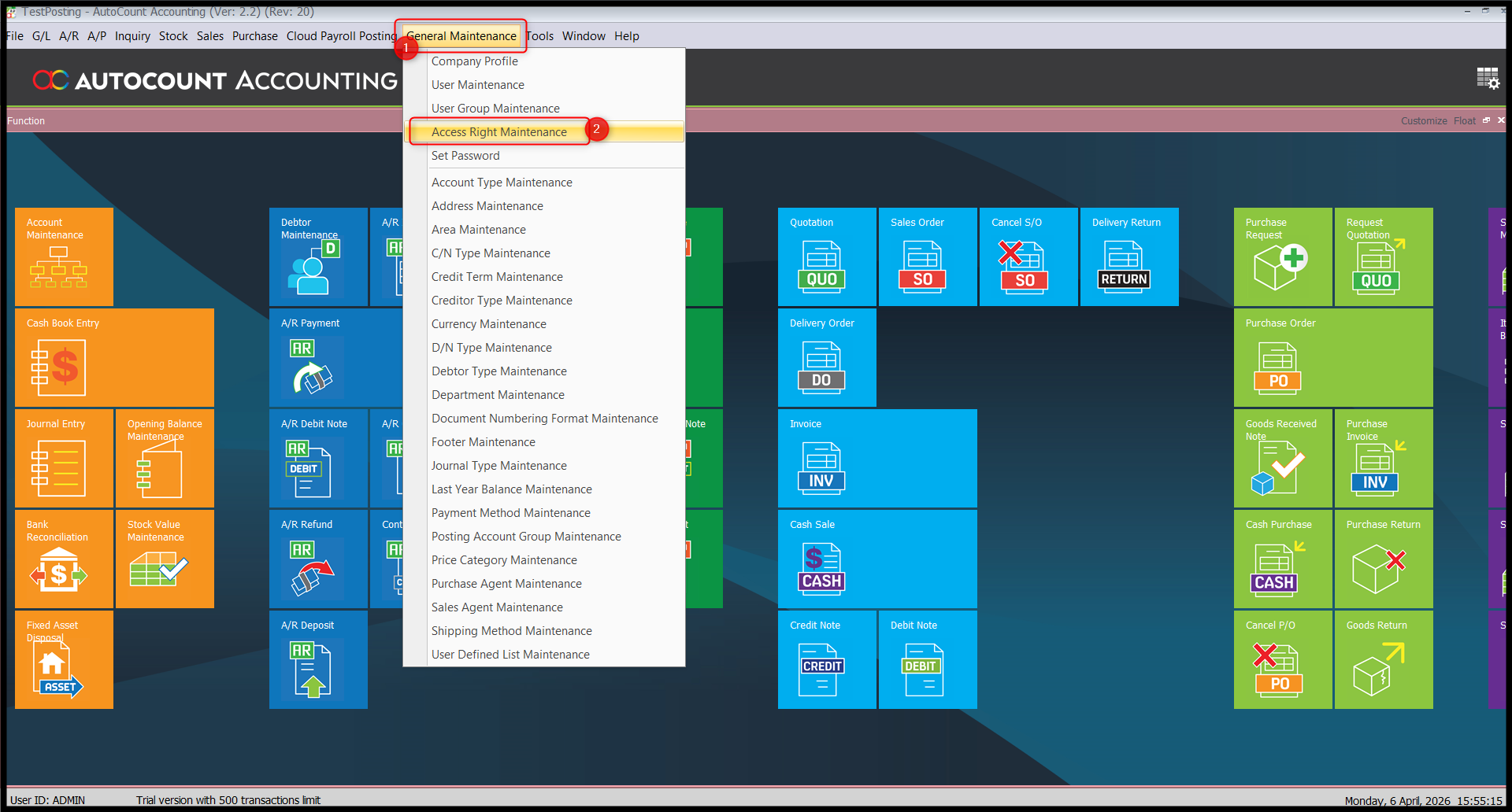 - For first time installation, configure access rights: Go to General Maintenance > Access Right Maintenance.