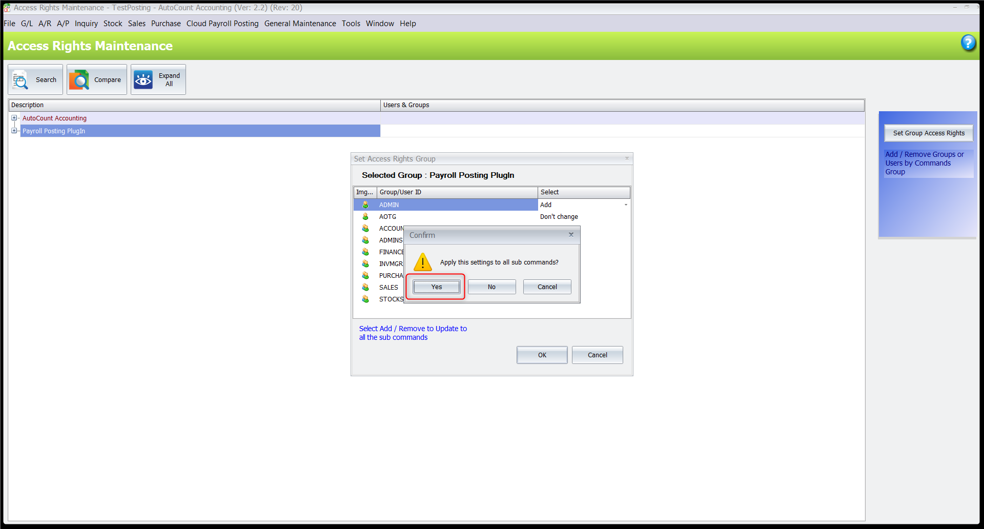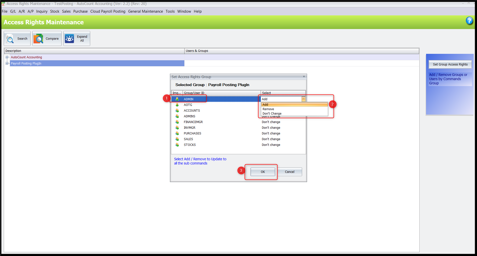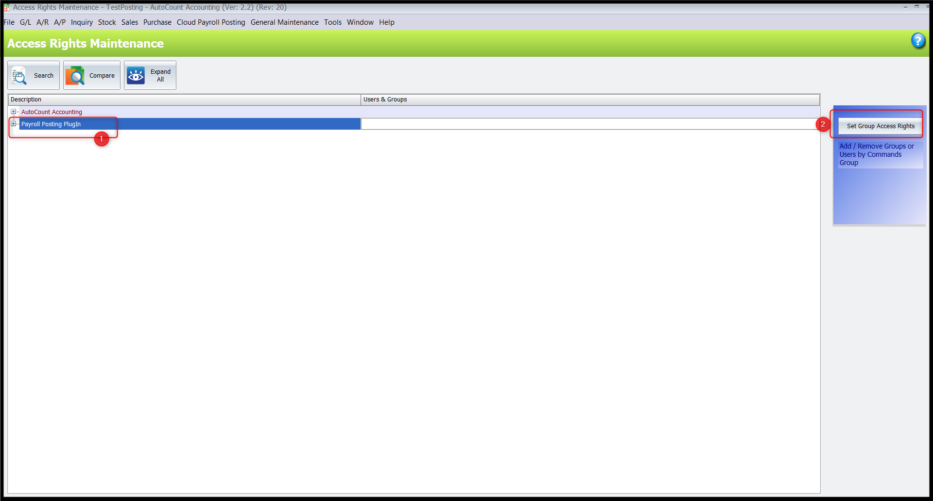 - Select Payroll Posting Plugin, then click Set Group Access Rights.